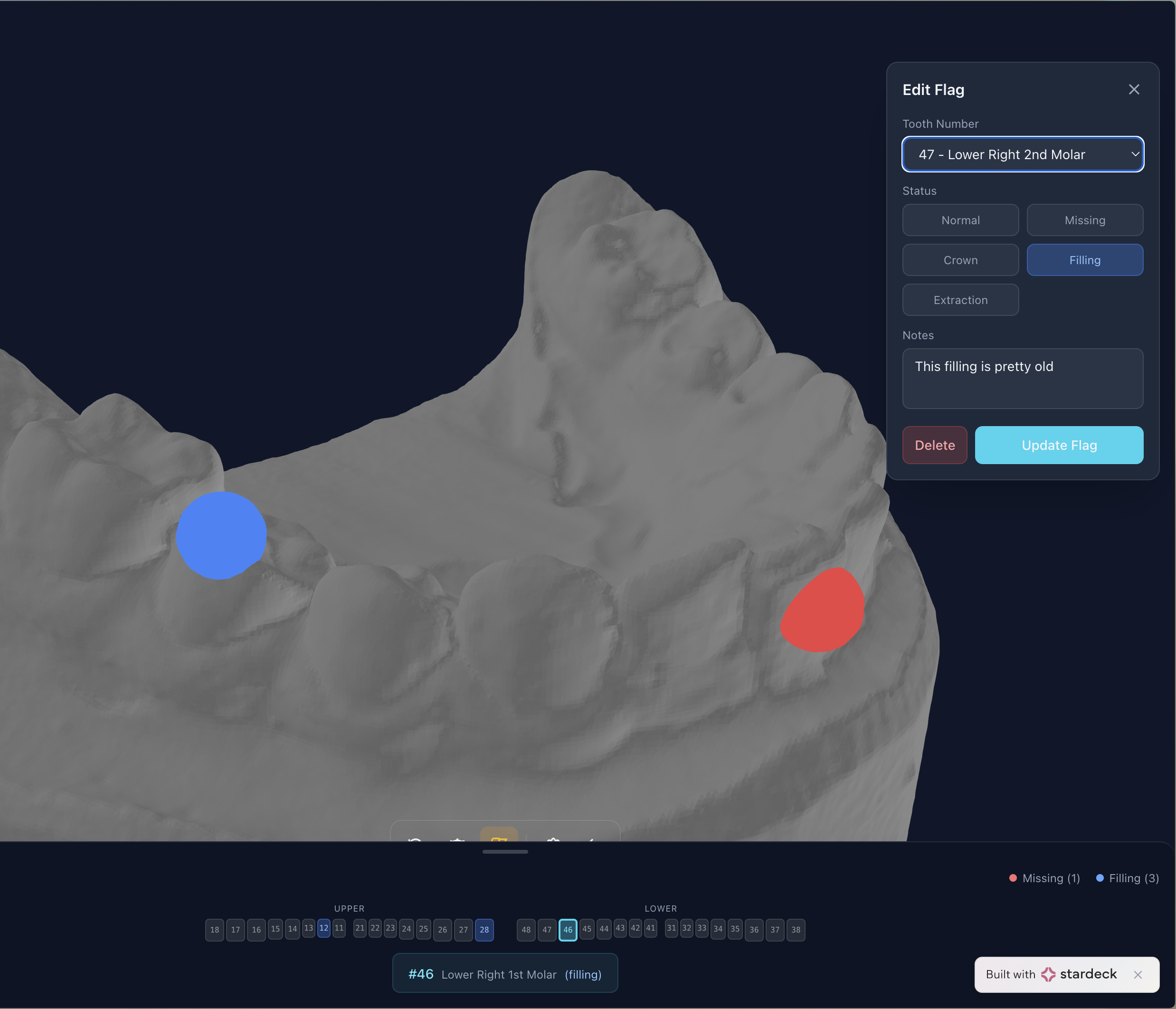Click a tooth on the chart, add your note, and it's saved with the scan. No more hunting through separate files to find your observations.
