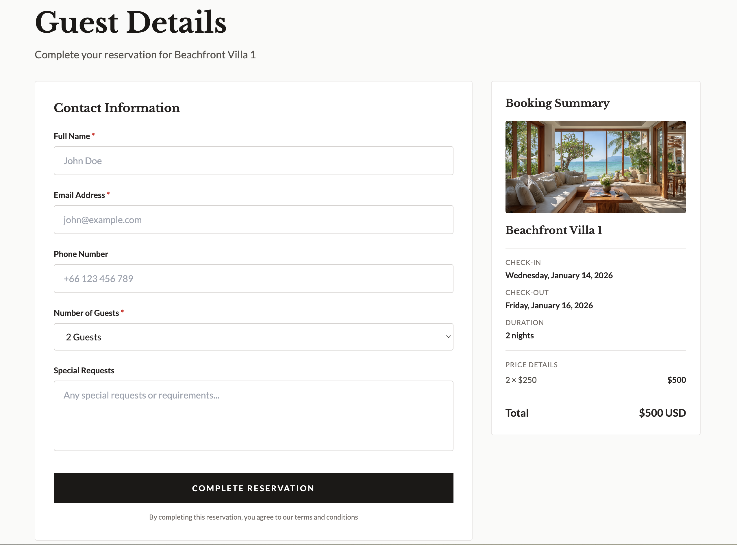 Guest information, special requests, and booking confirmation — all in one smooth flow. No redirects to external systems.